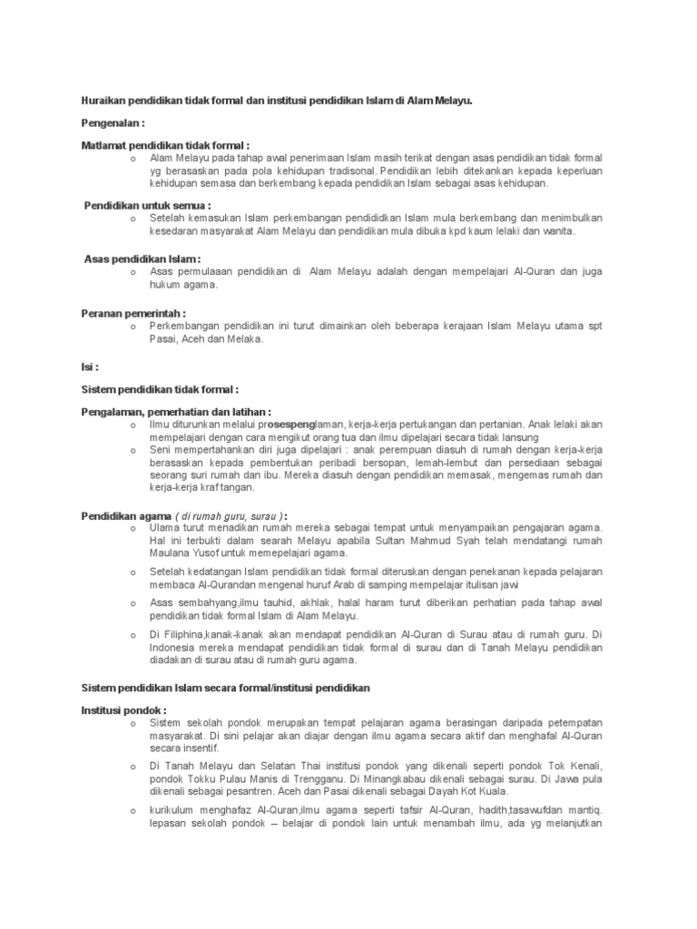 Huraikan Pendidikan Tidak Formal Dan Institusi Pendidikan Islam Di Alam Melayu Pdf